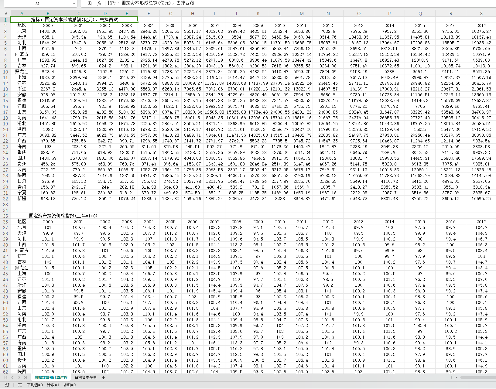 2018年至2023年这一特定时段,由于缺乏直接的固定资产价格指数,采用了消费者价格指数(CPI)作为替代,固定资产形成总额利用年增长率计算。该数据为研究人员理解中国各区域经济发展的资本积累动态、评估投资效率及分析生产函数提供了数据支持