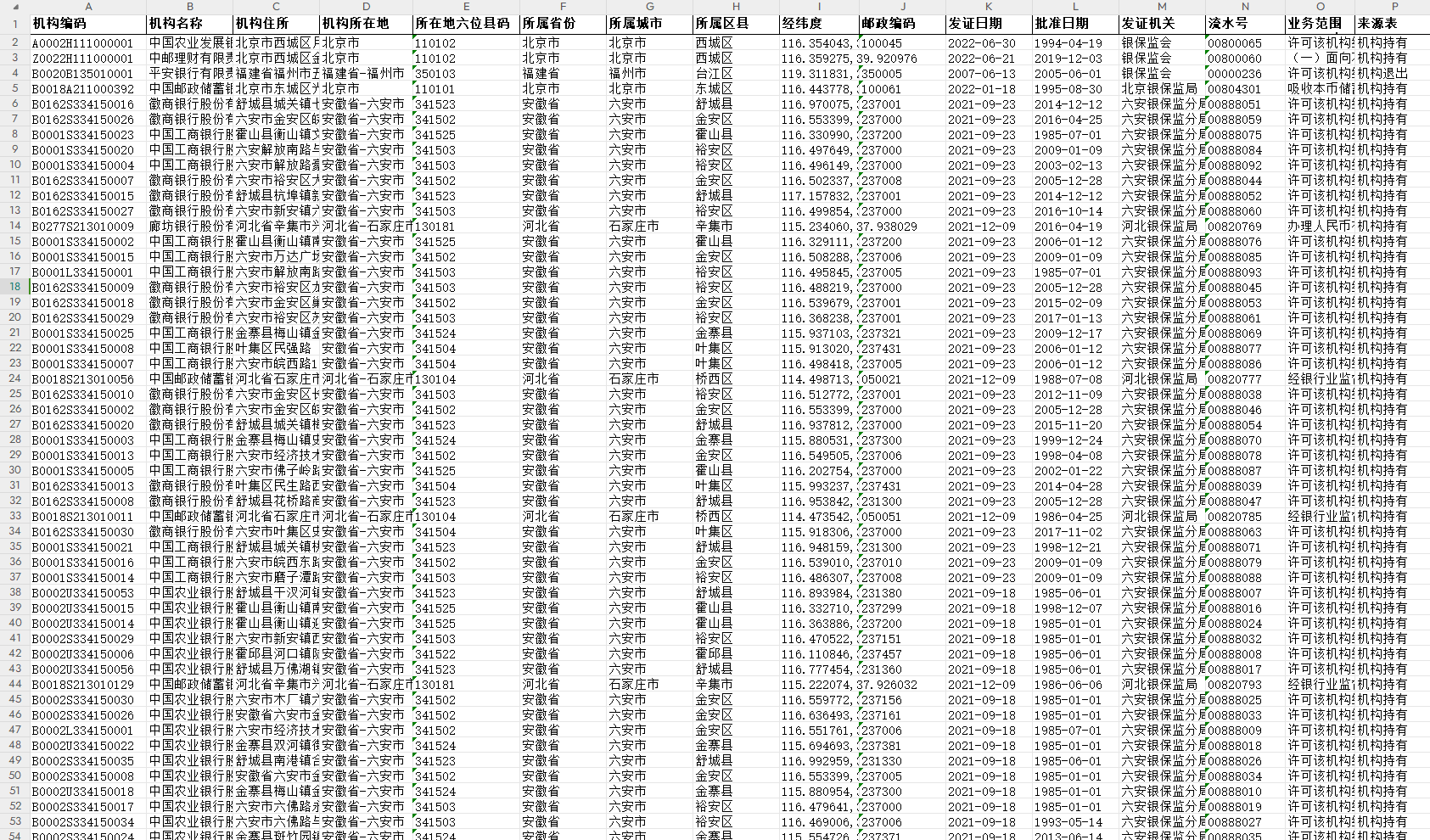 资料名称:2022-1949年中国省市县金融机构许可证网点明细信息数据 指标范围: 机构编码 机构名称 机构住所 机构所在地 所在地六位县码 所属省份 所属城市 所属区县 经纬度 邮政编码 发证日期 批准日期 发证机关 流水号 业务范围 来源表 退出或失控日期