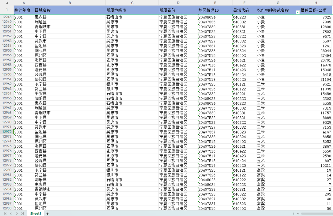 二、数据指标统计年度、县域名称、所属地级市、所属省份、地区编码ID、县域代码、农作物种类或名称、播种面积-公顷。