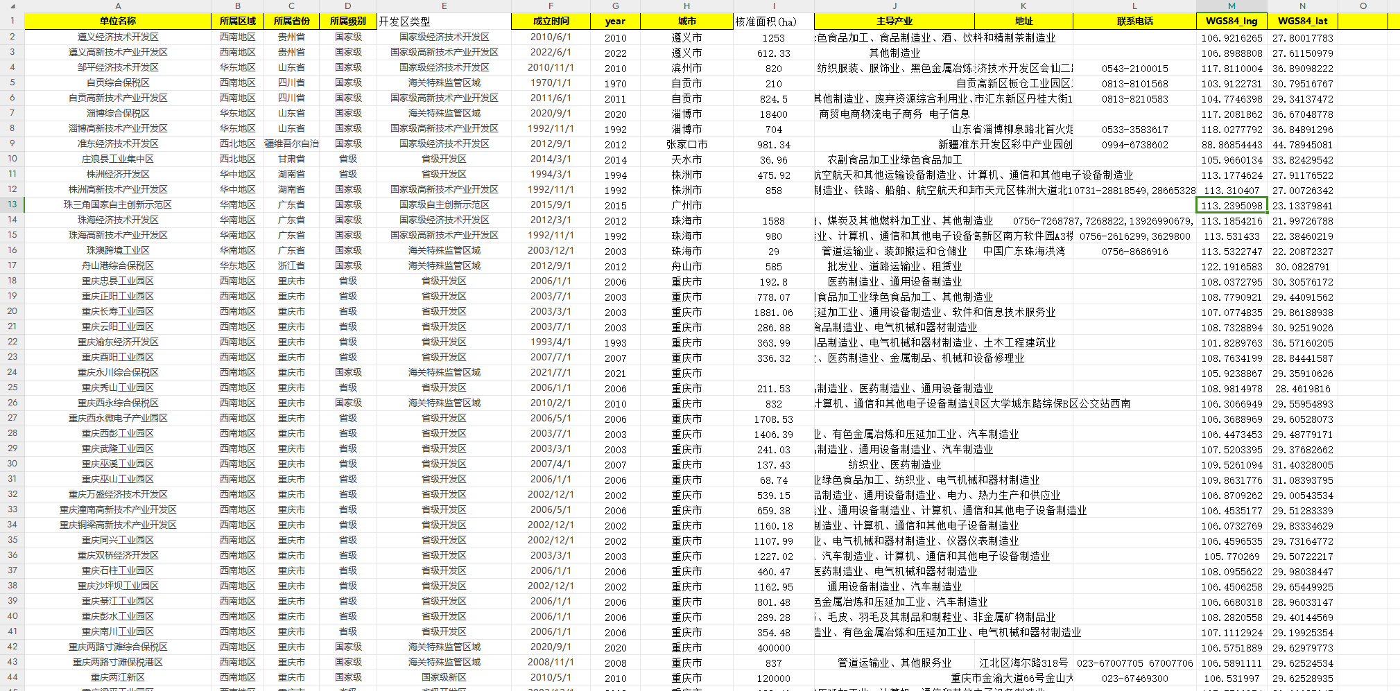 2.数据范围:所属省级行政区、省级行政区划代码、开发区名称、wGS84坐标系下的经度、wGS84坐标系下的纬度、开发区设立年份、开发区设立时间(年月)、开发区级别