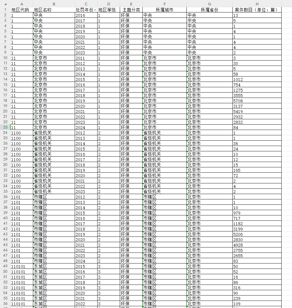 数据名称:全国各省、市、区县环保处罚案件统计数据