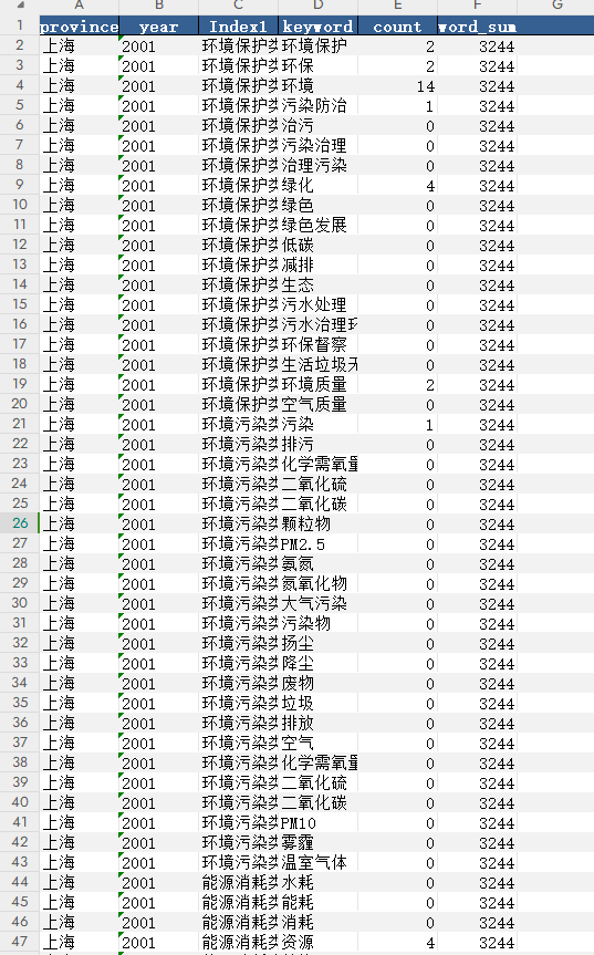 随着经济的发展和工业产业的腾飞,人们更多的从关注经济发展走向可持续生态经济发展,我国也于2020年9月22日在第七十五届联合国大会上提出了碳达峰、碳中和的目标。随着碳市场的建立和逐步完善,越来越多的政策与绿色环保概念相关,这无不彰显着环境治理是我国正积极应对的一个关键问题。通过各省绿色环保词如污染防治、治污、绿化、绿色发展、低碳、减排、生态、污水处理等出现的频率,我们可以大体上看出各地区对绿色发展的关注。同时,对绿色环保词频的研究也具有十分重要的意义,如以绿色词频数来衡量当地政府和企业所制定/面临的环境规制和环境监管等有助于探索当地经济的发展方向。相关研究成果发表在《财经研究》、《经济研究》等高质量期刊上。