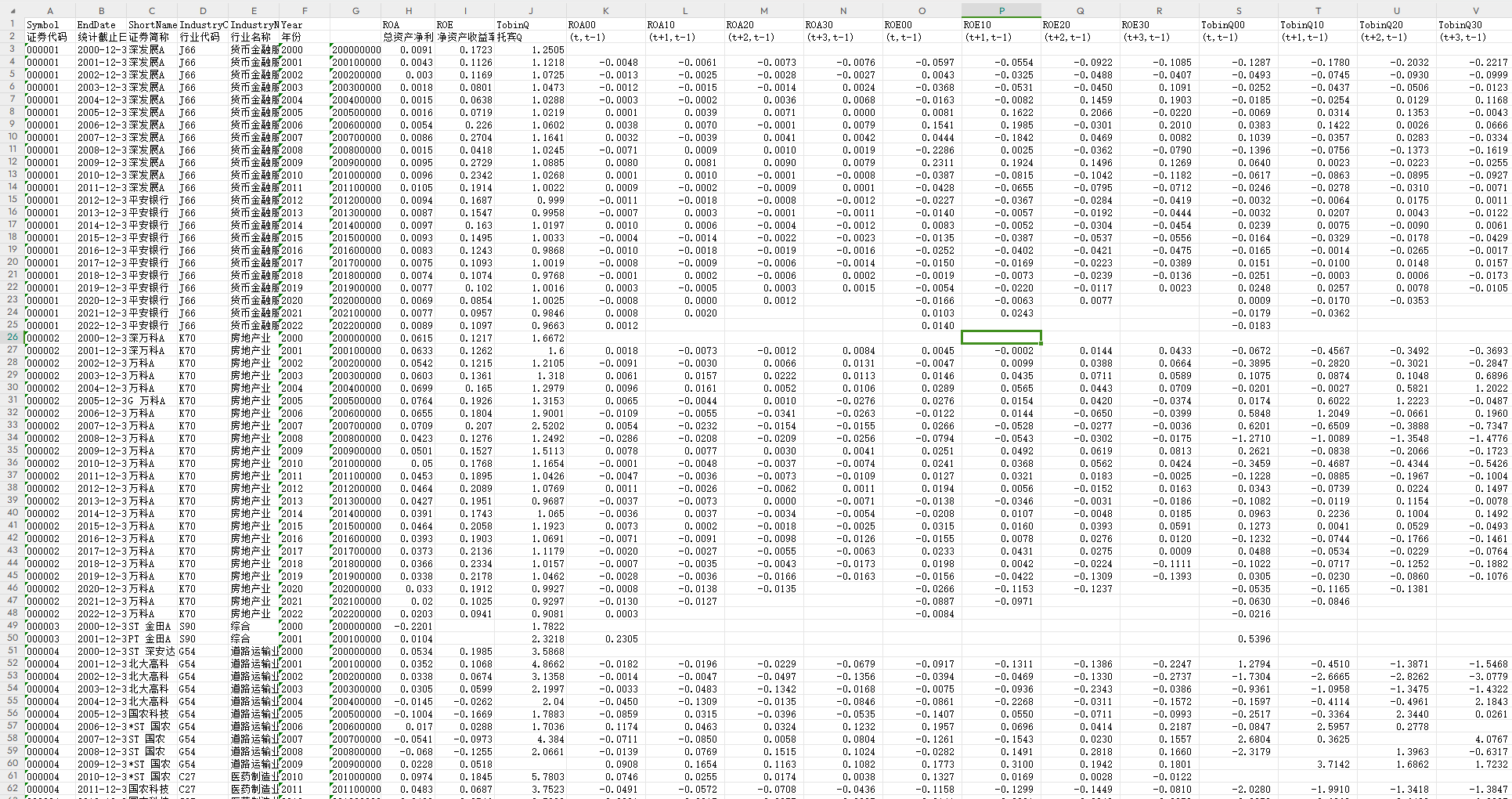 3.资料范围:附带原始数据来源,数据为电子表格格式,具体指标为证券代码 统计截止日期 证券简称 行业代码 行业名称 Year ROA ROE TobinQ ROA00 ROA10 ROA20 ROA30 ROE00 ROE10 ROE20 ROE30 TobinQ00 TobinQ10 TobinQ20 TobinQ30