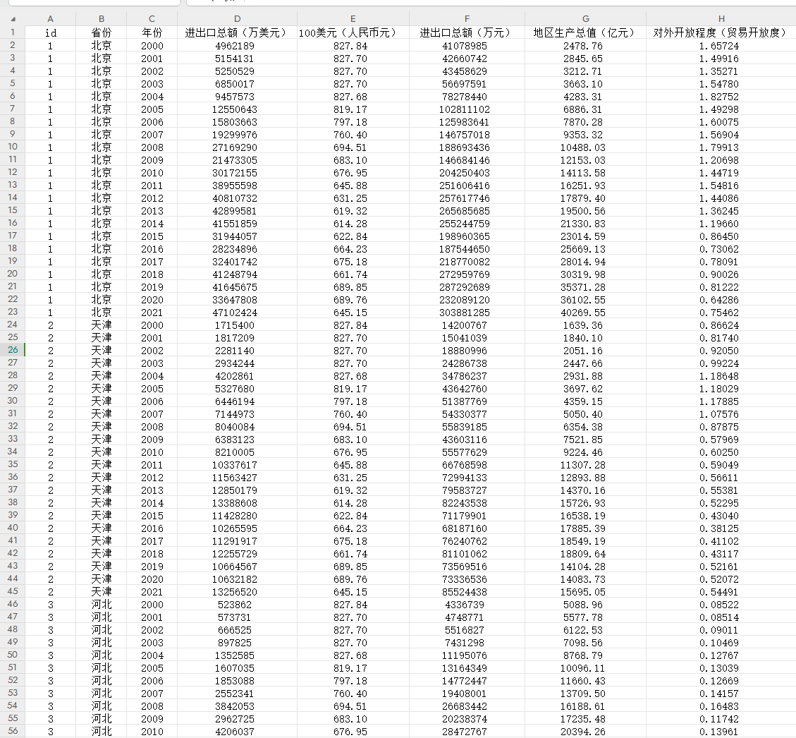 3.指标范围:包括 id 省份、年份、进出口总额(万美元)、100美元(人民币元)、进出口总额(万元)、地区生产总值(亿元)、对外开放程度(贸易开放度)