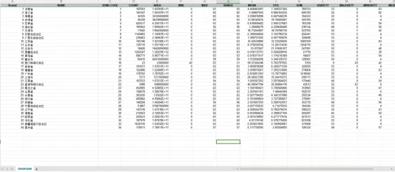 4.通过以表格显示分区统计,对栅格数据的值进行计算,本文所需的数据为夜间灯光总和,因此我们只需要统计总和字段就好,这样会快很多,以表格显示分区统计后输出的文件是dbf格式,我们可以通过表转Excel工具将其转换成我们常用的xlsx格式