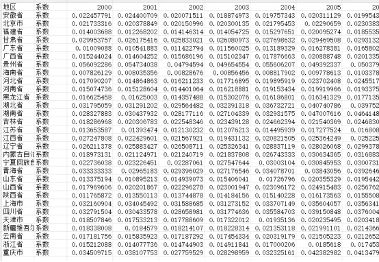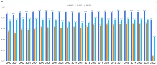 出结果可以看到2000-2022年夜间灯光与能源消耗量的线性相关性非常显著,可以进行下一步测试7.通过文献的计算方法,得出2000-2022年各省夜间灯光与能源消耗量之间的系