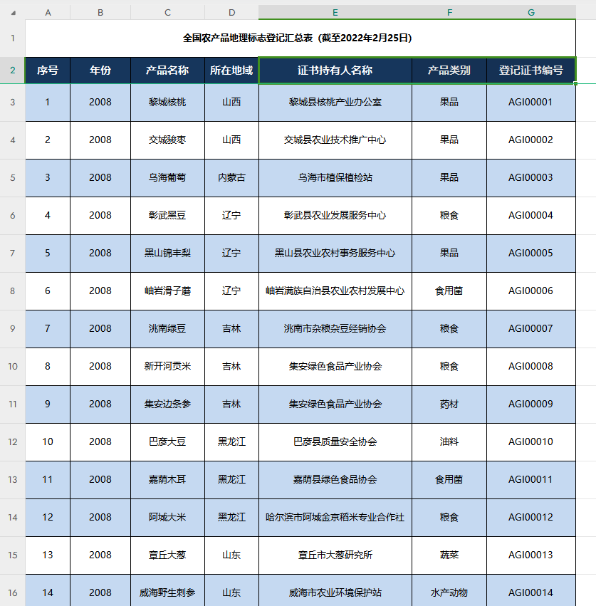 本数据展示了截至2022年2月25日的全国农产品地理标志登记汇总表,具体指标展示如下表: