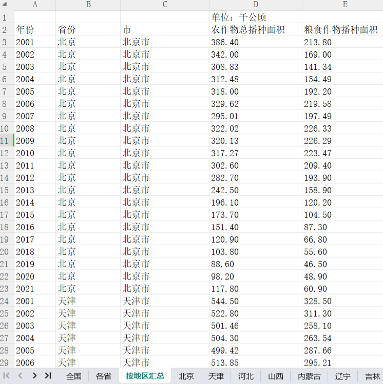 本数据一共包括34个表格:全国的、各省份的、按地区汇总以及31个省市单独的(例如:河北包括石家庄市、唐山市等)