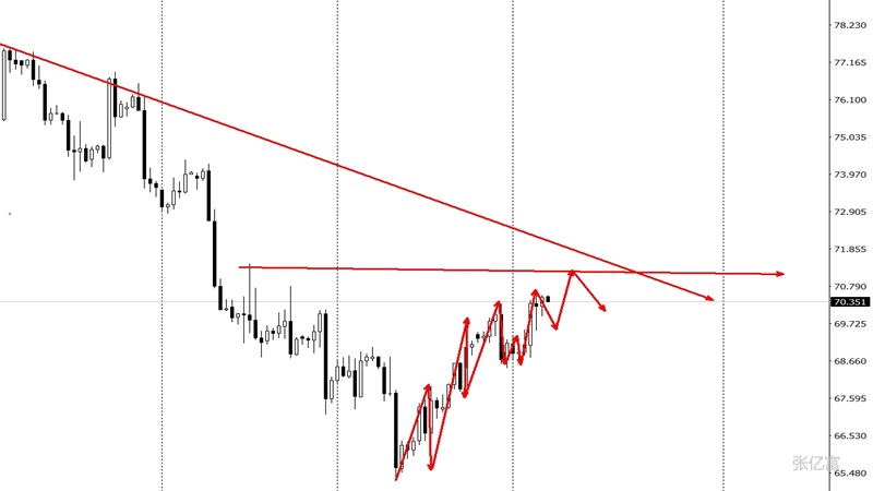 原油出现先跌后涨走势,回落在触及69.6附近之后油价出现了企稳反弹,随后多头出现了延续上涨,最高点触及71.3美元一带徘徊。原油日线级别上看,指标MACD红色量能衰竭,快慢线高位结死叉,KDJ和RSI指标同步死叉,短线有望延续下跌,但是近日在触及69.7之后油价出现了多头反弹,后市重点就在于前高阻力位是否破位。4小时级别上看,MA120均线压力点71.5承压回撤,震荡指标Z字转向指标出现顶部信号,而周线MACD绿色量能柱还是出于放量阶段,但是今日出现了多头增长迹象。综合以上分析,张亿富认为:原油双底之后再次上涨,关注前高破位情况,后市操作上考虑回撤布局多单为先,高空为辅,上方关注71.9-73.4美元阻力,下方关注69.7-69.0美元支撑。今日原油实盘在70.2-69.8分批多单,获利在71.2一带。
