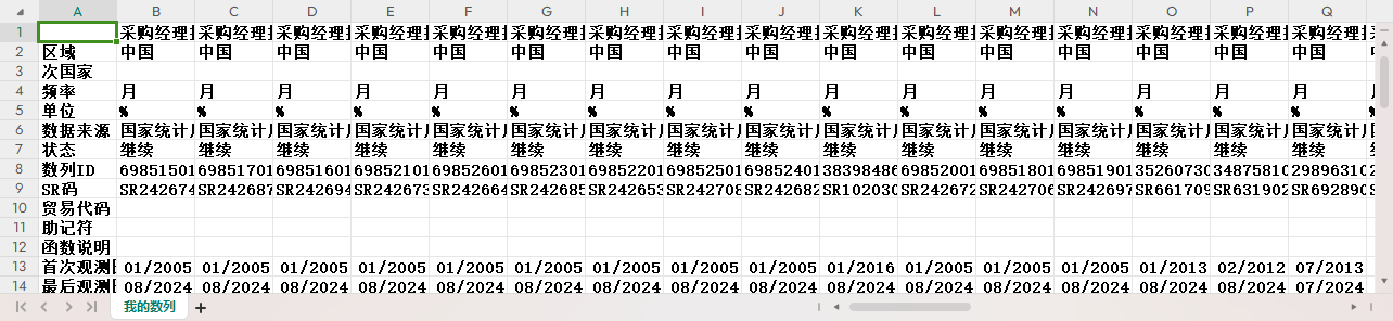 采购经理指数制造业2005-202408月度数据生产量新订单新出口订单在手订单产成品库存采购量