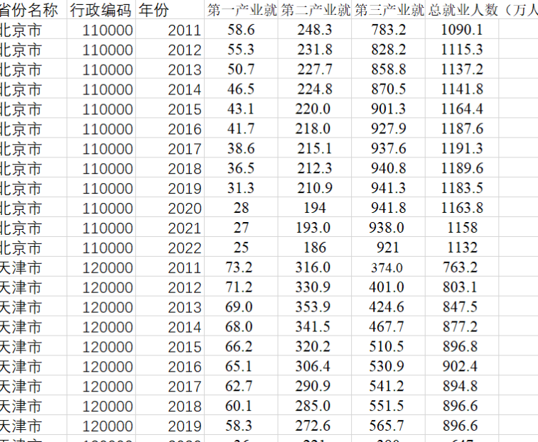 五、主要指标:省份、行政代码、年份、总就业人员数(万人)、第一产业就业人数(万人)、第二产业就业人数(万人)、第三产业就业人数(万人)