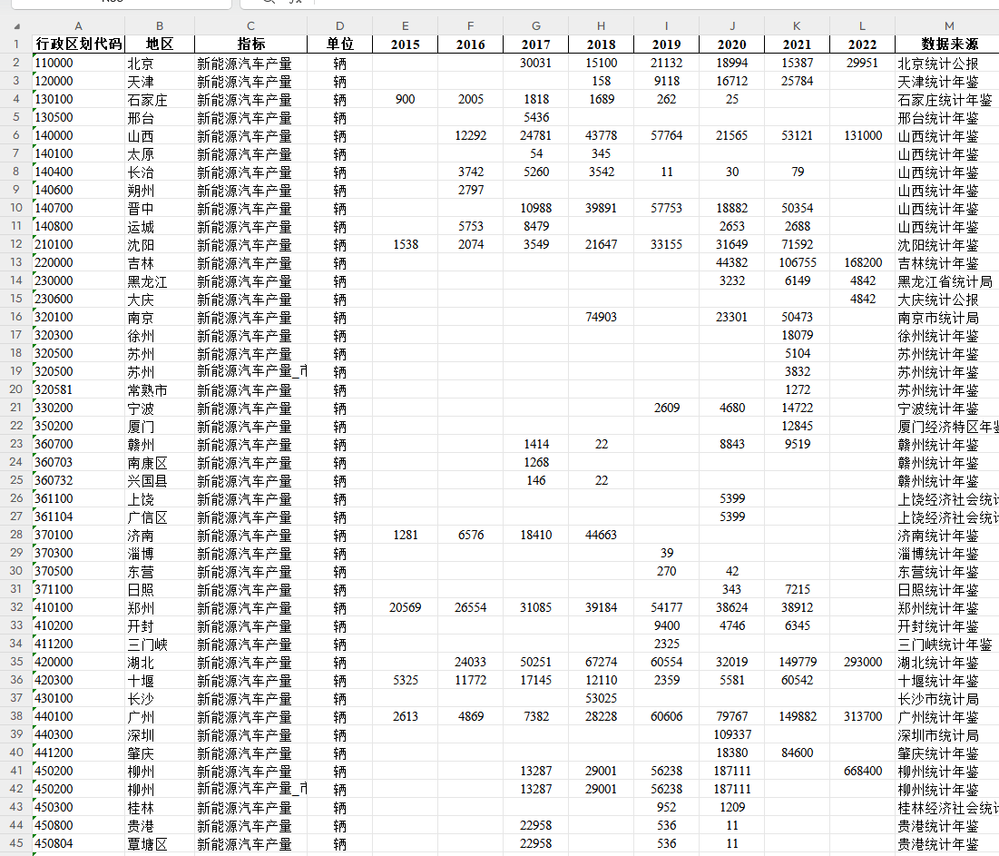 中国各地区-新能源汽车产量(2015-2022年).csv