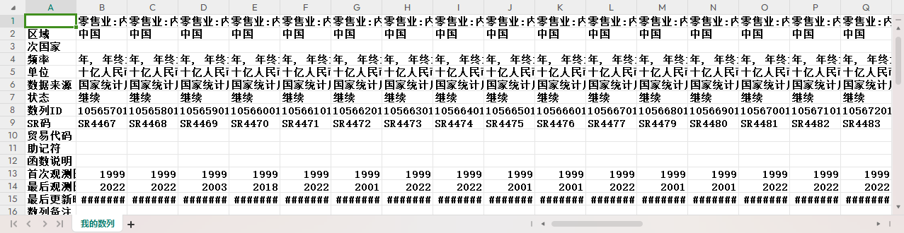 零售业:内资企业:流动资产 零售业:内资企业:流动资产:库存 零售业:内资企业:长期投资 零售业:内资企业:固定资产 零售业:内资企业:固定资产原价 零售业:内资企业:固定资产原价:生产经营用 零售业:内资企业:累计折旧 零售业:内资企业:累计折旧:本年折旧 零售业:内资企业:无形及递延资产 零售业:内资企业:无形资产 零售业:内资企业:资产总计 零售业:内资企业:流动负债 零售业:内资企业:长期负债 零售业:内资企业:负债合计 零售业:内资企业:所有者权益合计 零售业:内资企业:所有者权益合计:实收资本 零售业:内资企业:所有者权益合计:实收资本:国有 零售业:内资企业:所有者权益合计:实收资本:港澳台 零售业:内资企业:所有者权益合计:实收资本:外商 零售业:内资企业:营业收入 零售业:营业收入:内资企业:集体企业 零售业:营业收入:内资企业:股份合作企业 零售业:营业收入:内资企业:联营企业 零售业:营业收入:内资企业:有限责任公司 零售业:营业收入:内资企业:其它企业 零售业:营业收入:内资企业:私营企业 零售业:营业收入:内资企业:股份有限公司 零售业:营业收入:内资企业:国有企业 零售业:内资企业:营业收入净额 零售业:内资企业:营业成本 零售业:内资企业:经营费用 零售业:内资企业:经营费用:运杂费 零售业:内资企业:销售税金及附加 零售业:内资企业:商品销售利润 零售业:商品销售利润:内资企业:集体企业 零售业:商品销售利润:内资企业:股份合作企业 零售业:商品销售利润:内资企业:联营企业 零售业:商品销售利润:内资企业:有限责任公司 零售业:商品销售利润:内资企业:其它企业 零售业:商品销售利润:内资企业:私营企业 零售业:商品销售利润:内资企业:股份有限公司 零售业:商品销售利润:内资企业:国有企业 零售业:内资企业:代购代销收入 零售业:内资企业:主营业务利润 零售业:内资企业:其它业务利润 零售业:内资企业:管理费用 零售业:内资企业:管理费用:税金 零售业:内资企业:管理费用:财产保险 零售业:内资企业:管理费用:劳动待业险 零售业:内资企业:财务费用 零售业:内资企业:财务费用:利息支出 零售业:内资企业:营业利润 零售业:内资企业:补贴收入 零售业:内资企业:利润总额 零售业:内资企业:应交所得税 零售业:内资企业:应付利润 零售业:工资总额:内资企业