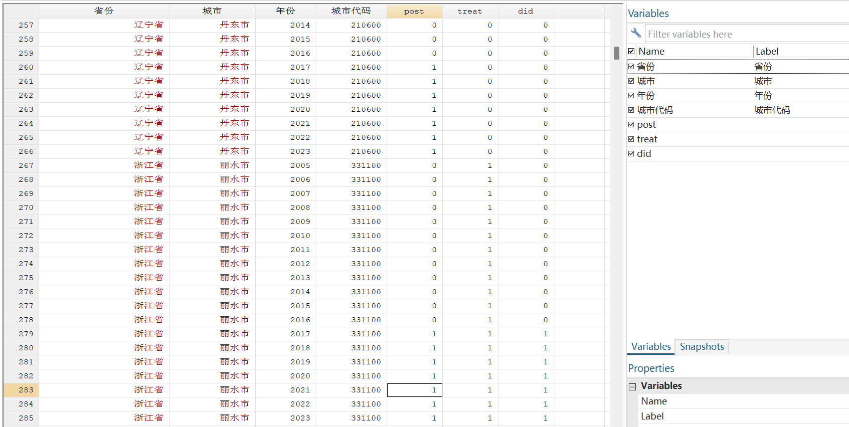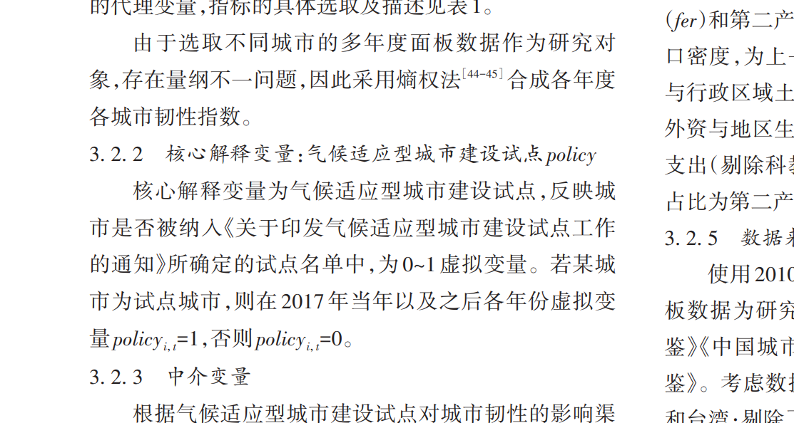 2.测算方式:核心解释变量为气候适应型城市建设试点,反映城市是否被纳入《关于印发气候适应型城市建设试点工作的通知》所确定的试点名单中,为 0~1虚拟变量。若某城市为试点城市,则在 2017年当年以及之后各年份虚拟变量policyi,t=1,否则policyi,t=03