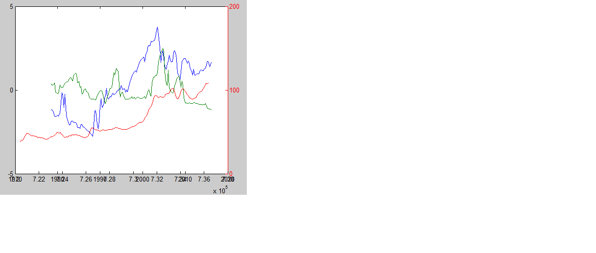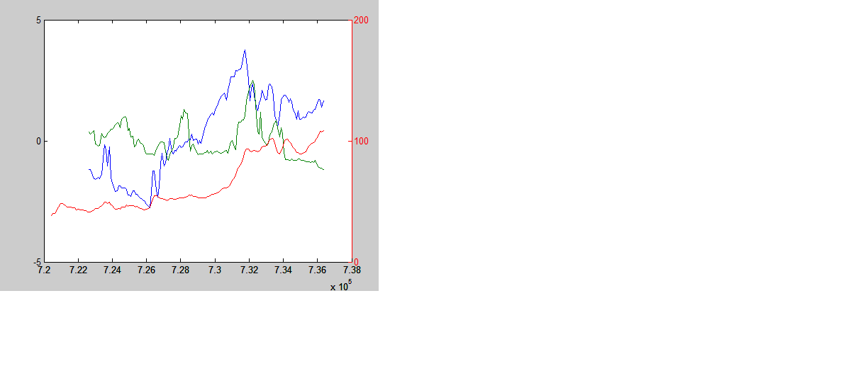 现在使用plotyy做两个纵轴图形,横轴dateX是时间,由于Matlab使用数值表示时间,所以先试用命令[hAx, hLine1, hLine23] = plotyy(dateX,result,dateX, y);