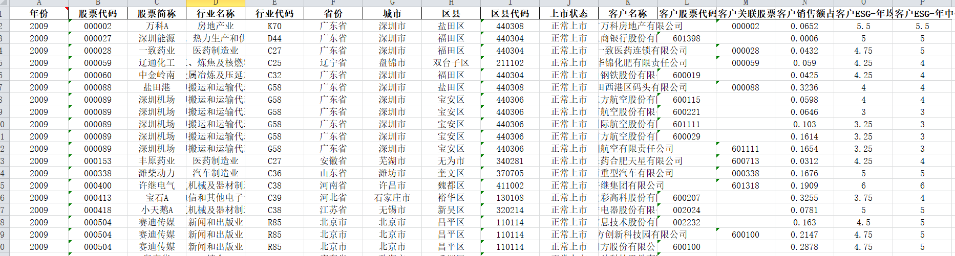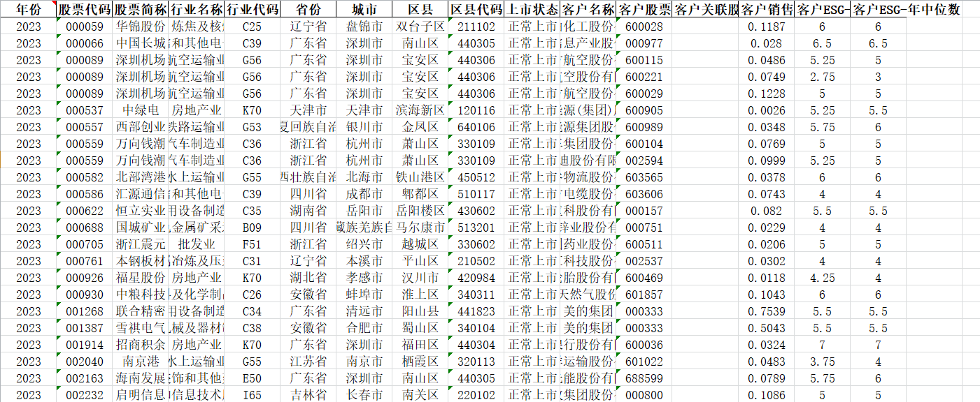 3.资料范围:1791家企业,近7000个样本,具体指标为年份 股票代码 股票简称 行业名称 行业代码 省份 城市 区县 区县代码 上市状态 客户名称 客户股票代码 客户关联股票代码 客户销售额占比 客户ESG-年均值 客户ESG-年中位数