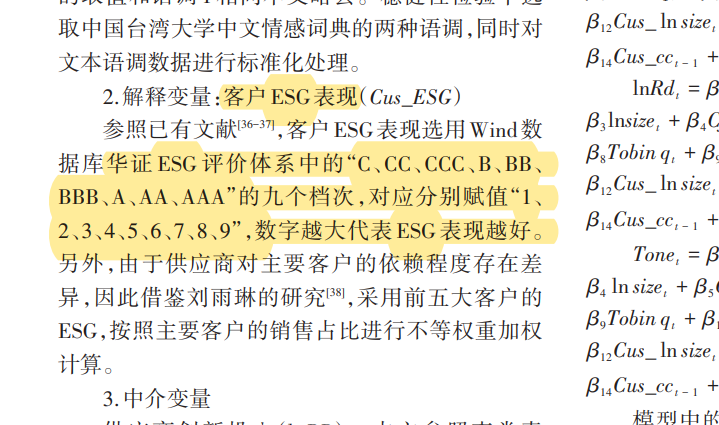2.测算方式:参照C刊《经济问题》李普玲(2024)老师的做法,客户ESG表现选用Wind数据库华证 ESG 评价体系中的“C、CC、CCC、B、BB、BBB、A、AA、AAA”的九个档次,对应分别赋值“1、2、3、4、5、6、7、8、9”,数字越大代表 ESG 表现越好。