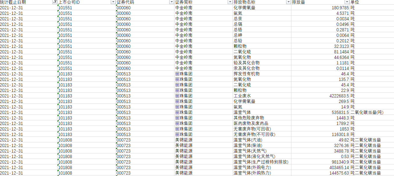 2.数据范围:统计截止日期、上市公司ID、证券代码、证券简称、排放物名称、排放量、单位,排放物包括固体废弃物、碳排放、化学物质等