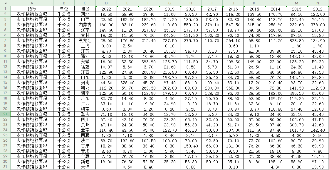 农作物受灾面积、农作物绝收面积、农作物成灾面积、农作物受灾面积_旱灾、农作物成灾面积_旱灾、指标、单位、地区、年份、数据