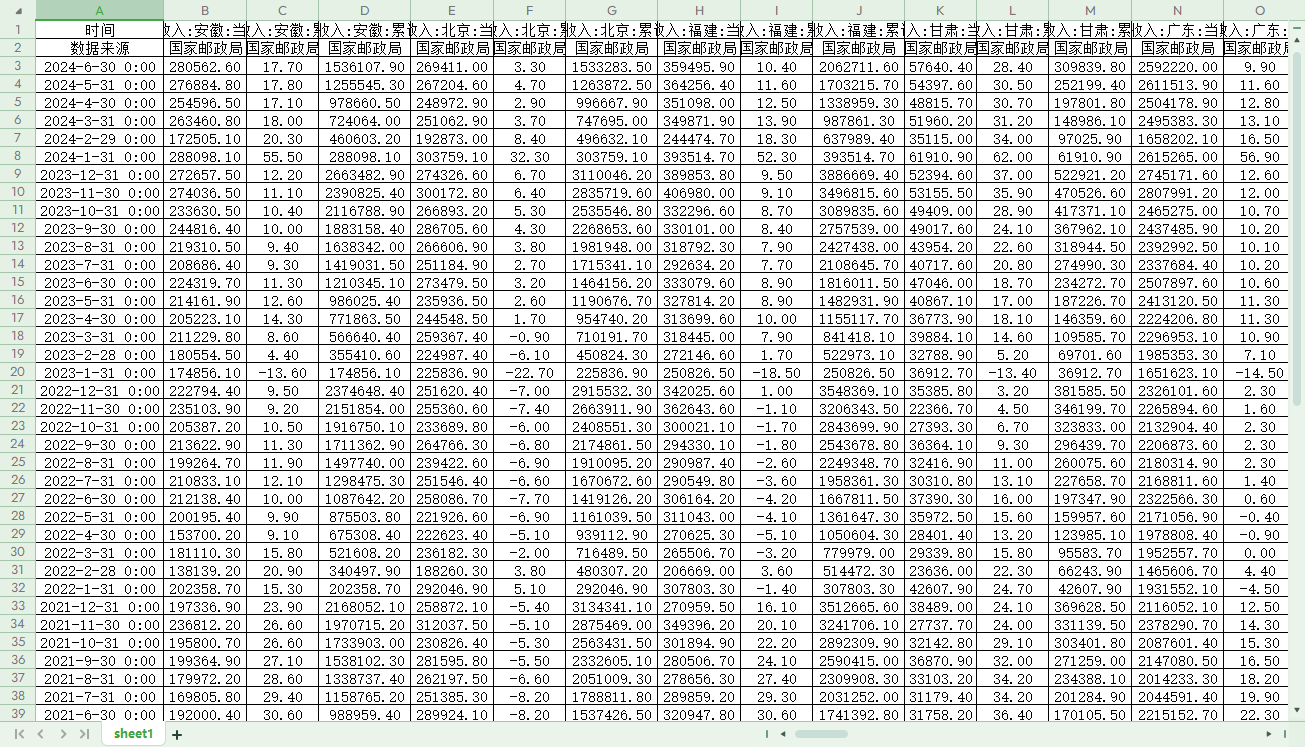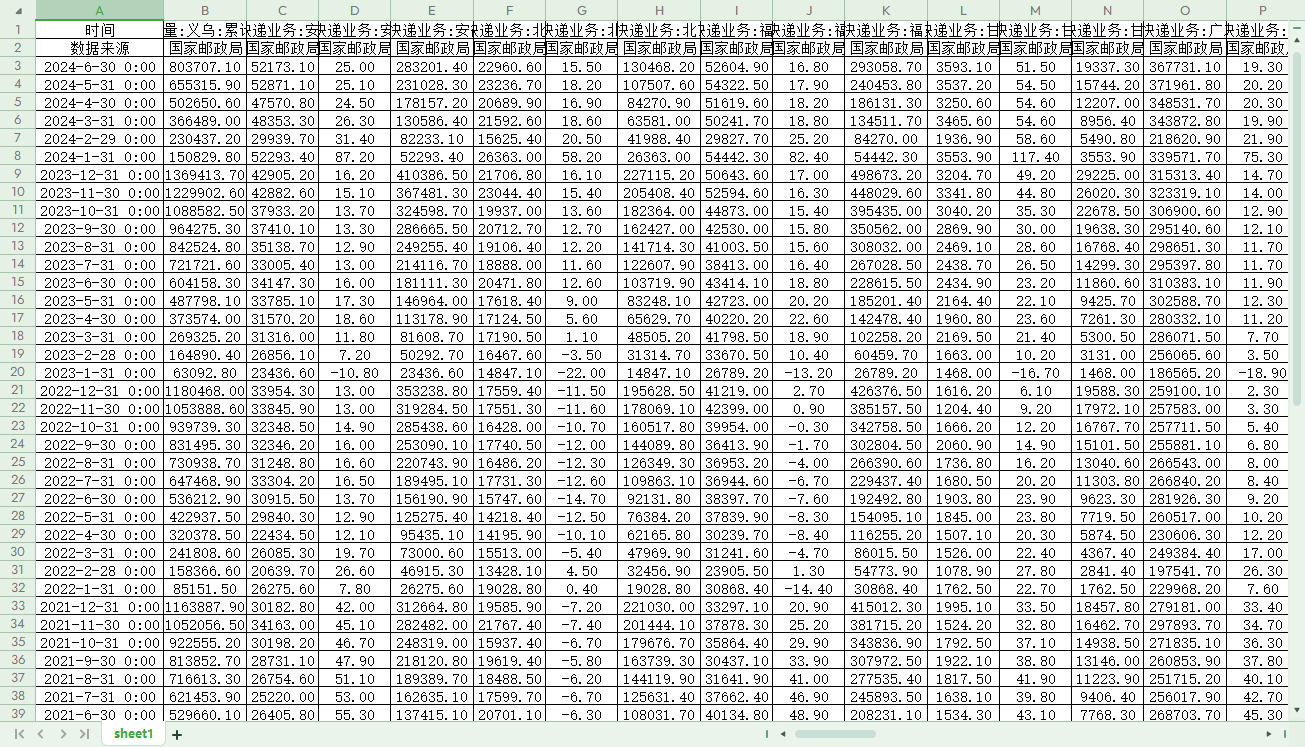 快递企业业务量、邮政行业业务总量:当期值、邮政行业业务总量:累计同比、邮政行业业务总量:累计值、快递企业业务收入:当期值、快递企业业务收入:累计同比、快递企业业务收入:累计值等指标