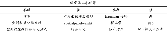 上表格模型的基本参数信息,包括具体的空间计量模型名称,空间权重矩阵名称及是否对其进行标准化处理等,模型估计方法等,表格中仅展示模型的参数信息等无特别分析意义。