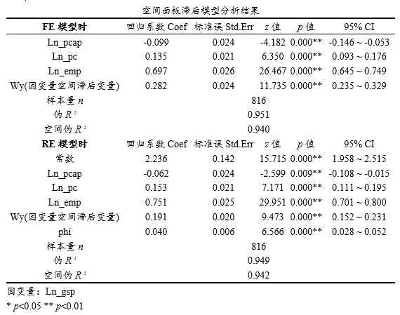 上表格依旧展示的是空间面板滞后模型的结果,并且包括FE固定效应和RE随机效应时的结果具体解读上与普通回归的解读保持一致性,在面板滞后模型时,其模型中包括因变量空间滞后变量,其实际意义为其他地区对于本地区的影响。如果是面板误差模型时,其模型中包括误差项空间滞后项。