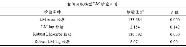 上图展示空间面板模型时比较关键的四个检验,包括LM检验和稳健LM检验,并且分别分为LM误差检验和LM滞后检验;