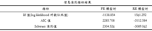 上表格展示信息准则结果表格,包括llf值和另外两个值即AIC值和Schwarz准则值,llf值通常越大越好,但是AIC值和Schwarz准则值均是越小越好,如果希望对比模型优劣,可考虑使用上述三个指标,并且上述指标分为FE模型和RE模型均有提供。多数情况下并不需要关注上述指标。