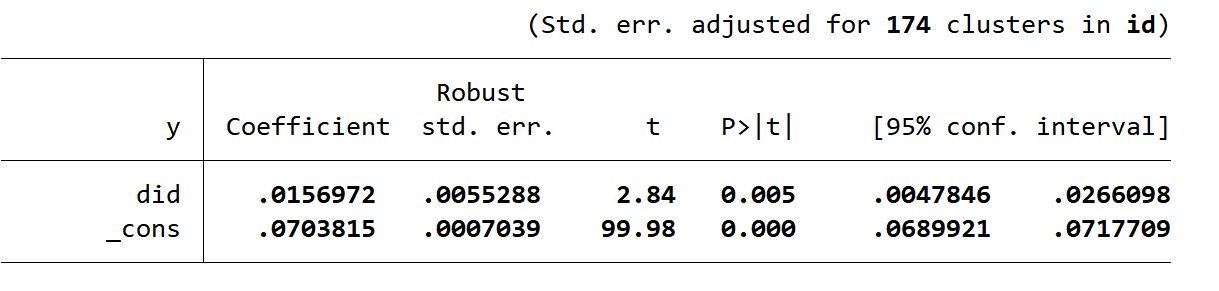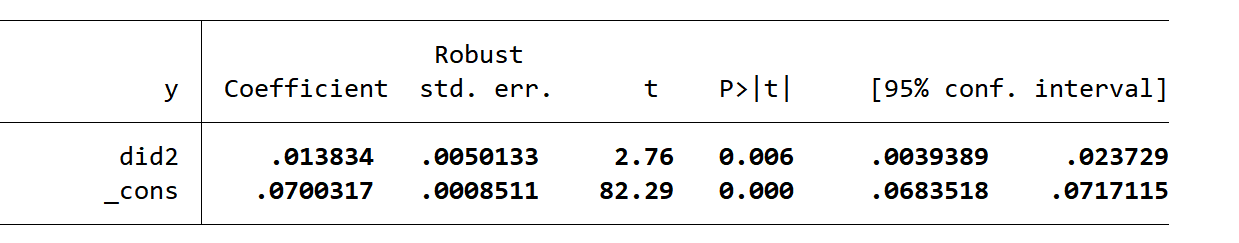reghdfe Y c.did#i.time i.time [控制变量], absorb(固定效应) cluster(聚类变量)