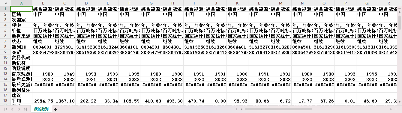 综合能源平衡表:可供消费的能源总量 综合能源平衡表:可供消费的能源总量:一次能源生产量 综合能源平衡表:可供消费的能源总量:一次能源生产量:水电 综合能源平衡表:可供消费的能源总量:一次能源生产量:核电 综合能源平衡表:可供消费的能源总量:回收能 综合能源平衡表:可供消费的能源总量:贸易差额 综合能源平衡表:可供消费的能源总量:进口量 综合能源平衡表:可供消费的能源总量:进口量:进口量 综合能源平衡表:可供消费的能源总量:进口量:境内轮船和飞机在境外的加油量 综合能源平衡表:可供消费的能源总量:出口量 综合能源平衡表:可供消费的能源总量:出口量:出口量 综合能源平衡表:可供消费的能源总量:出口量:境外轮船和飞机在境内的加油量 综合能源平衡表:可供消费的能源总量:年初年末库存差额 综合能源平衡表:加工转换投入和产出量 综合能源平衡表:加工转换投入和产出量:火力发电 综合能源平衡表:加工转换投入和产出量:供热 综合能源平衡表:加工转换投入和产出量:洗选煤 综合能源平衡表:加工转换投入和产出量:炼焦 综合能源平衡表:加工转换投入和产出量:炼油 综合能源平衡表:加工转换投入和产出量:制气 综合能源平衡表:加工转换投入和产出量:制气:焦炭再投入量 综合能源平衡表:加工转换投入和产出量:煤制品加工 综合能源平衡表:损失量 综合能源平衡表:能源消费 综合能源平衡表:终端消费量 综合能源平衡表:终端消费量:农、林、牧、渔业 综合能源平衡表:终端消费量:工业 综合能源平衡表:终端消费量:工业:用作原料、材料 综合能源平衡表:终端消费量:建筑业 综合能源平衡表:终端消费量:交通运输、仓储及邮电通迅业 综合能源平衡表:终端消费量:批发零售贸易、住宿和餐饮业 综合能源平衡表:终端消费量:生活消费 综合能源平衡表:终端消费量:生活消费:城镇 综合能源平衡表:终端消费量:生活消费:乡村 综合能源平衡表:终端消费量:其他 综合能源平衡表:平衡差额