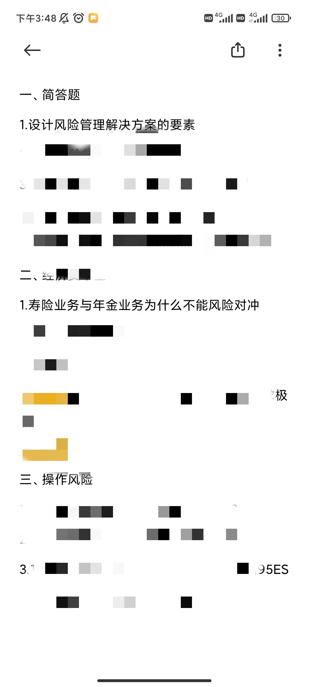 第一次考试飘过,现在考精算模型,来论坛找真题练练,没找到,发现已经有大佬分享了精算风险管理考试的真题,那我来补充下吧,计算题10题和三个大题,大题下分别有4、5个小题,还有之前的笔记。考了69分,价格就定69米,或者有精算模型的真题互换都行,V:18955214389。