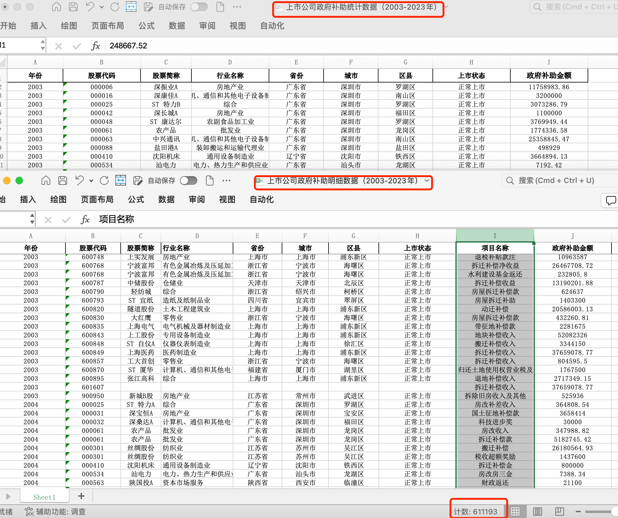 数据格式:Excel格式,同时含政府补助金额(总补贴金额)、和补贴明细数据(补贴项目名称)