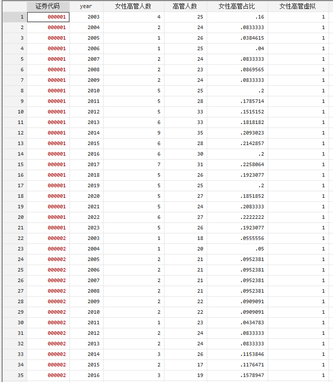 具体指标包括 证券代码 year 女性高管人数 高管人数 女性高管占比 女性高管虚拟