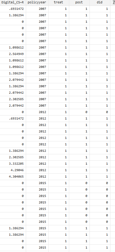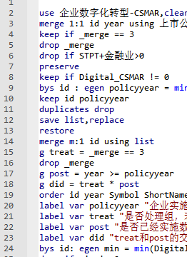 具体指标如下:企业代码 年份 证券代码 股票简称 行业名称-证监会2012年版 行业代码 数字化转型程度 企业实施数字化转型的年份 是否处理组,若企业实施数字化转型则属于处理组,赋值为1,否则为0 是否已经实施数字化转型,若企业已经实施数字化转型则赋值为1,否则为0 treat和post的交互项 五维度词频数年报合计 人工智能技术_年报 区块链技术_年报 云计算技术_年报 大数据技术_年报 数字技术应用_年报