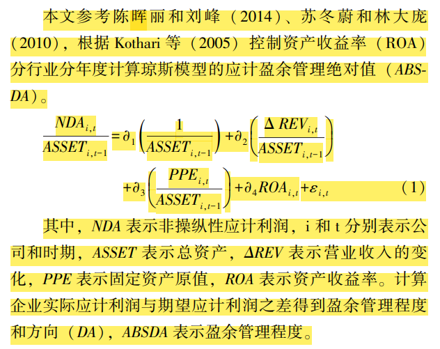 TA:总应计利润=营业利润–经营活动现金流净额;NDA:非操控性应计利润;DA:操控应计利润,绝对值越大,盈余管理空间越大,会计信息质量越低;△REVt:营业收入变动额;△RECt:应收账款变动额;PPEt:t期固定资产净额; At-1:消除规模效应,用t-1年期末总资产;公式(1)进行分行业分年度回归,得到回归系数带入公式(2)得到不可操控应计利润NDA,然后在带入公式(3),得到修正的可操控应计利润DA。制造业“C”字头代码取2位,其他行业取1位,进行行业分类,在计算中剔除行业分类后样本数少于10个以及相关数据缺失的样本。