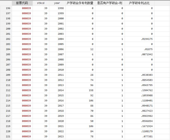 从全部上市公司所申请的专利数据通过关键词检索,对这些专利的申请人信息进行筛选,将上市公司与高校、研究院、研究所联合申请的专利定义为产学研合作专利。测算企业的产学研合作专利数量占企业当年专利申请总数的比例作为产学研合作变量,该变量越大说明企业参与产学研合作的比例越大,产学研合作在其全部创新活动中的重要性越高。并设置虚拟变量,当年公司是否有进行产学研合作。