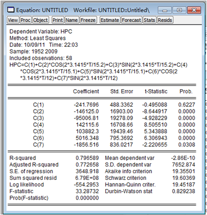 今天自己闲着没事做,然后在中国统计网上找了点中国GDP数据(1952年~2009年)。我在Eviews中用Hodrick-Prescott滤波将GDP年数据分解成T(趋势)与C(循环)。然后我对C(循环)数据进行傅里叶变换生成谱密度表,在里面找出一个高能量频点,将这个频点代入傅里叶级数方程,然后把C(循环)作为因变量进行数据拟合,最后再对第一次回归后的残差再进行频谱分析寻找第二个高能量频点如此我迭代了三次。最后回归方程的拟合优度为79.66%(这应该是很高的数值了)。附上Eviews里面输出的结果。