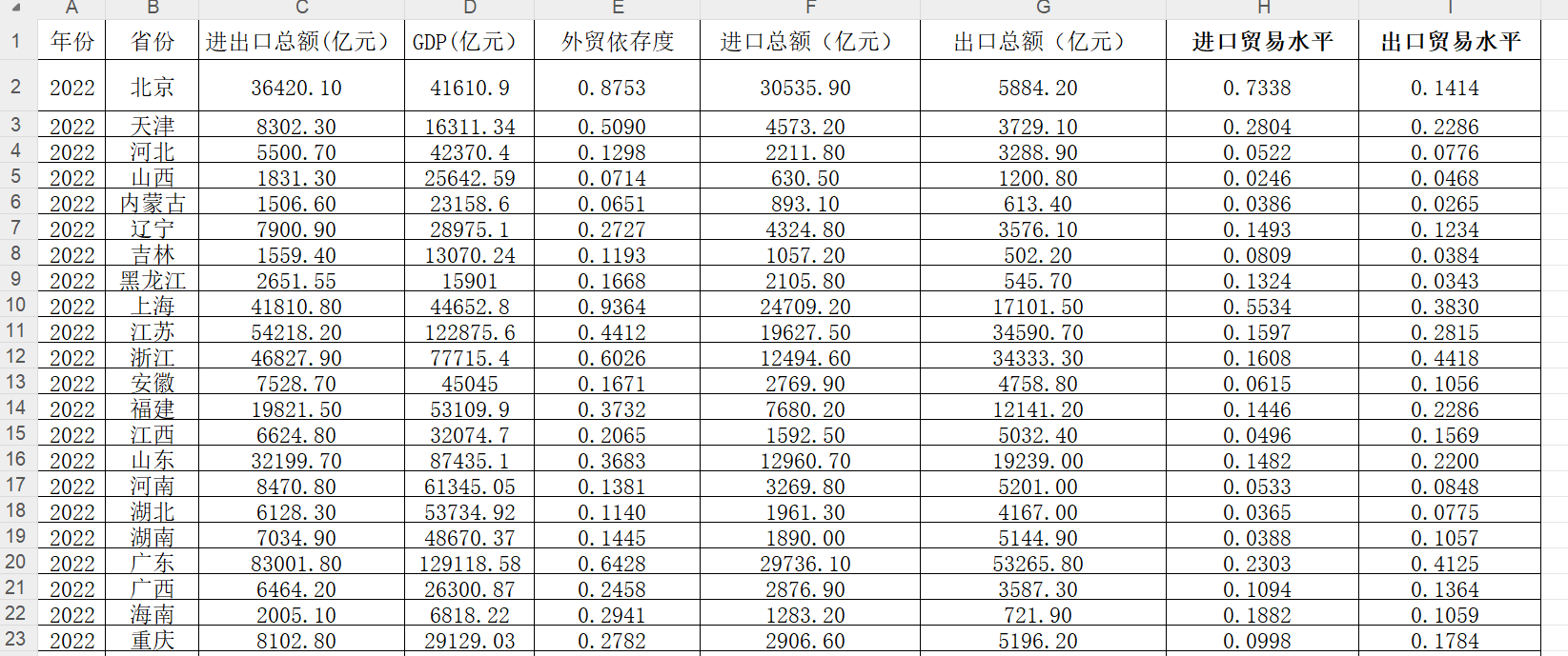 2022-1997年中国省级外贸依存度、进口出口贸易水平数据