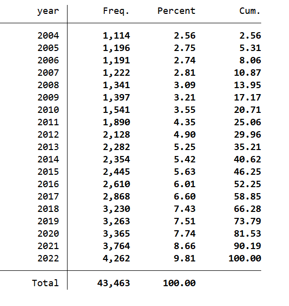 样本选择:全部A股2004-2022年数据(“股权性质”数据是从2003年开始,公式中用到了滞后一期的变量,所以会造成缺失一年的数据,经过处理之后的数据起点为2004年)
