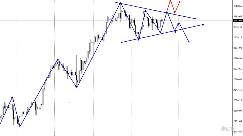黄金今日出现先涨后跌走势,在触及2667美元之后,金价出现了逐步遇阻回调,在大非农利空影响下,金价直线下跌触及2630一带企稳徘徊。日线中阳带有较长下影线,形态上表现出下方有支撑的视觉,但是高位超买区域的这个形态效果会大打折扣的。四小时级别上看,如果日内2667站稳,那么下周可能会进一步走震荡偏多。总体的上升通道保持完好。重点关注2630附近这里得失,不破高位震荡概率加大。综合以上分析,张亿富认为:黄金在数据打压下出现了承压迹象,短线依旧处于区间范围,下周操作上考虑反弹做空为先,低多为辅,上方关注2663-2667美元阻力,下方关注2630-2620美元/盎司。