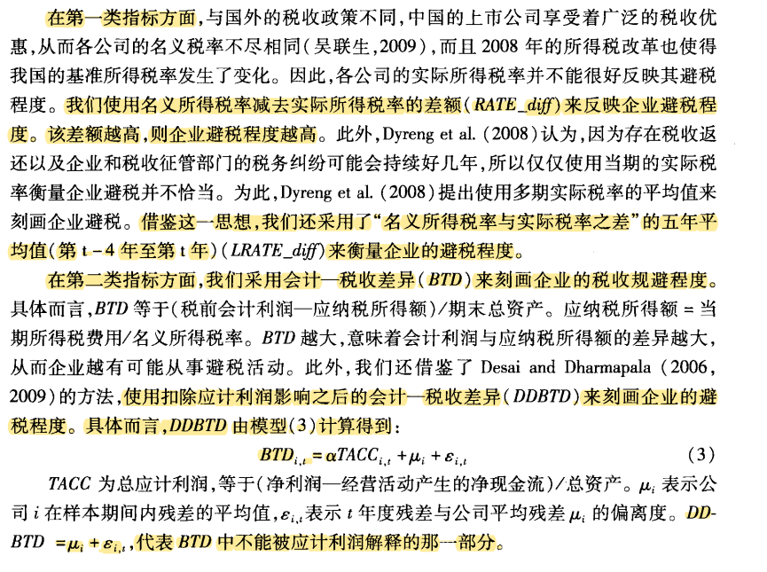 BTD等于(税前会计利润一应纳税所得额)/期末总资产。应纳税所得额=当期所得税费用/名义所得税率=(所得税费用-递延所得税费用)/名义所得税率。BTD越大,意味着会计利润与应纳税所得额的差异越大,从而企业越有可能从事避税活动。