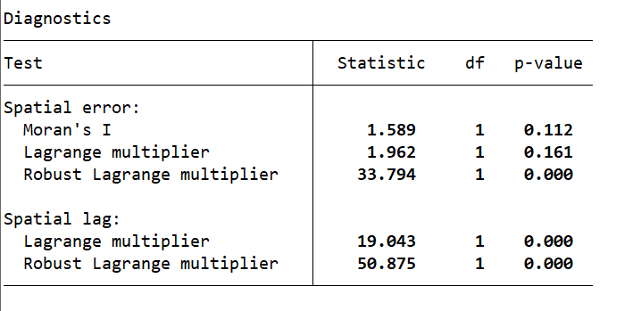 现在的问题是首先不知道LM检验过程是否可以对空间权重矩阵进行标准化,另外标准化之后的LM检验结果如果看空间滞后的两个检验都拒绝原假设是没问题的,但是空间误差的只有最后一个是拒绝原假设的,不确定这个结果算不算通过检验了,还是需要进一步分析。