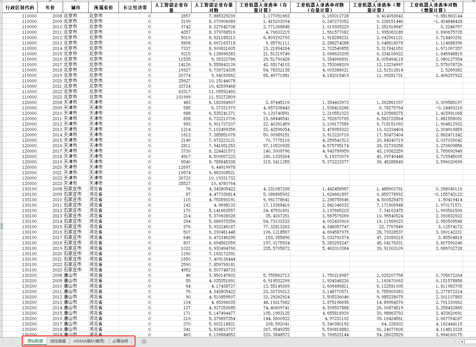 2008-2023年271个地级市人工智能企业存量数据工业机器人渗透率excel+dta面板数据
