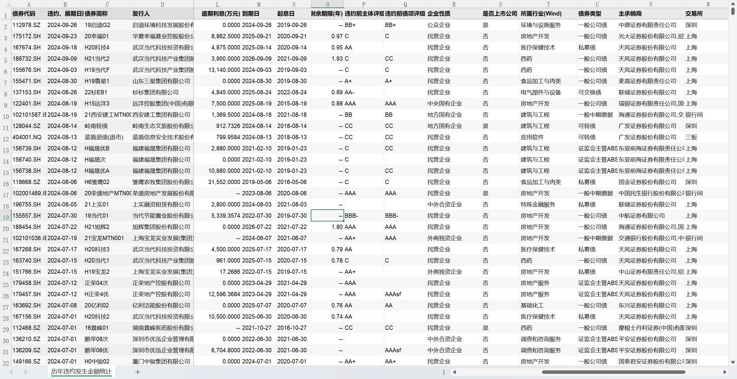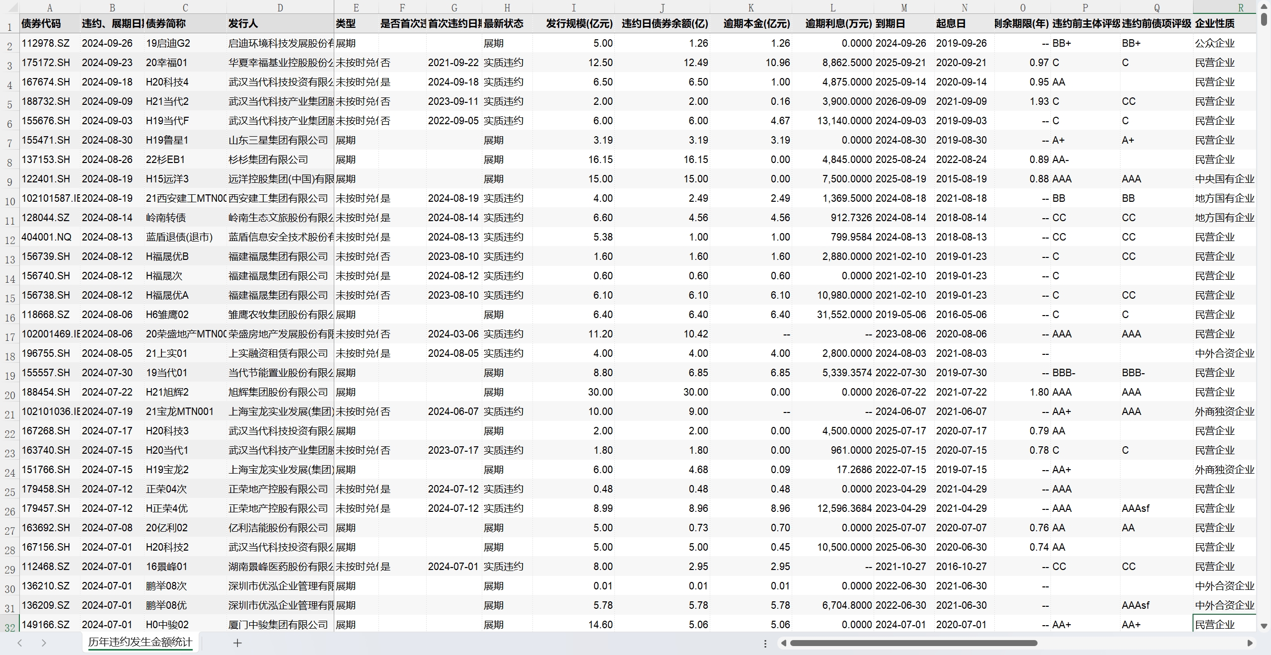 2014-2024年9月30日 违约债券信息统计 债券违约 违约债券 违约金额 债券余额 逾期本金 逾期利息 剩余期限 企业性质