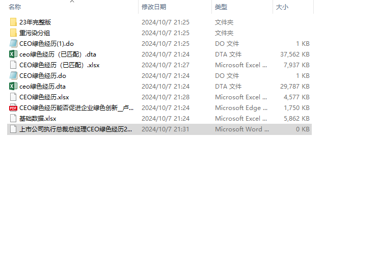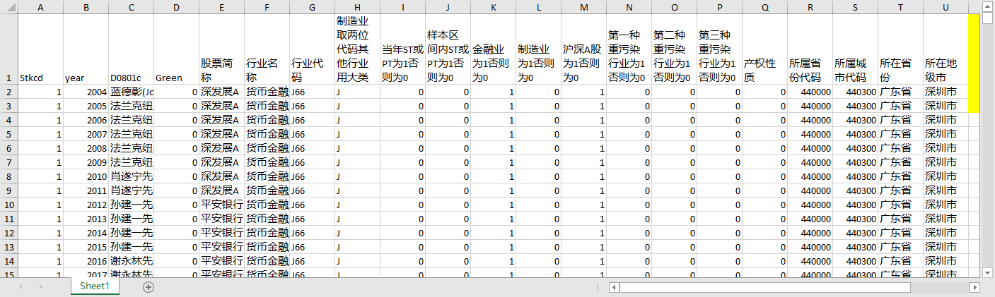 Stkcd year D0801c Green 股票简称 行业名称 行业代码 制造业取两位代码其他行业用大类 当年ST或PT为1否则为0 样本区间内ST或PT为1否则为0 金融业为1否则为0 制造业为1否则为0 沪深A股为1否则为0 第一种重污染行业为1否则为0 第二种重污染行业为1否则为0 第三种重污染行业为1否则为0 产权性质 所属省份代码 所属城市代码 所在省份 所在地级市