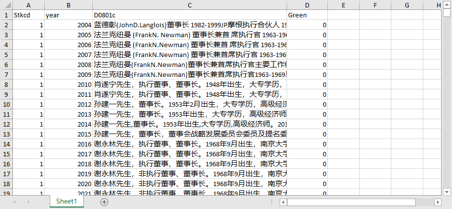 方法:根据现有研究(姜付秀和黄继承,2013;许年行和李哲,2016),从高管个人简历数据中查找CEO以前是否接受过“绿色”相关教育或从事过“绿色”相关工作,若企业CEO具有绿色经历,Green取值1,否则,取值0。