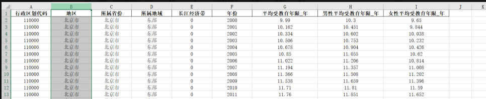 参考陈熠辉(2023)等人的计算方式,根据第五次人口普查(点击查看)、第六次人口普查(点击查看)、第七次人口普查(点击查看),整理了地级市的平均受教育年限(男、女),并对中间年份数据进行线性插值