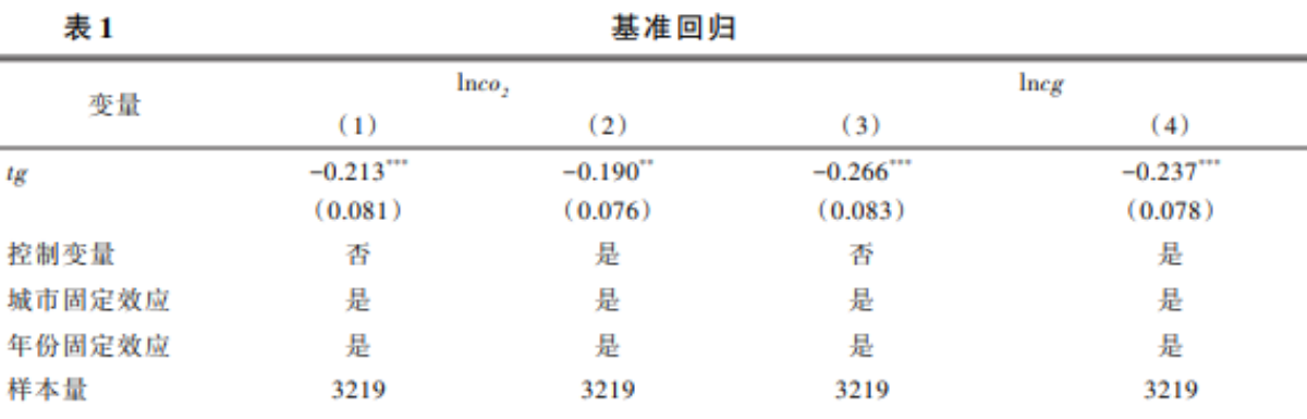 式(8)中,i 表示第 i 个城市,t 表示年份,Yit为低碳转型,具体包括碳排放总量和碳排放强度。tgit是基于“碳达峰目标”构造的代理变量,若 i 城市在 t 年设立了碳达峰目标,则 tgit 在此年及之后均取值为 1,否则为 0。controlit 为控制变量,γt 和 μi 分别为时间、个体固定效应,εit为随机扰动项。