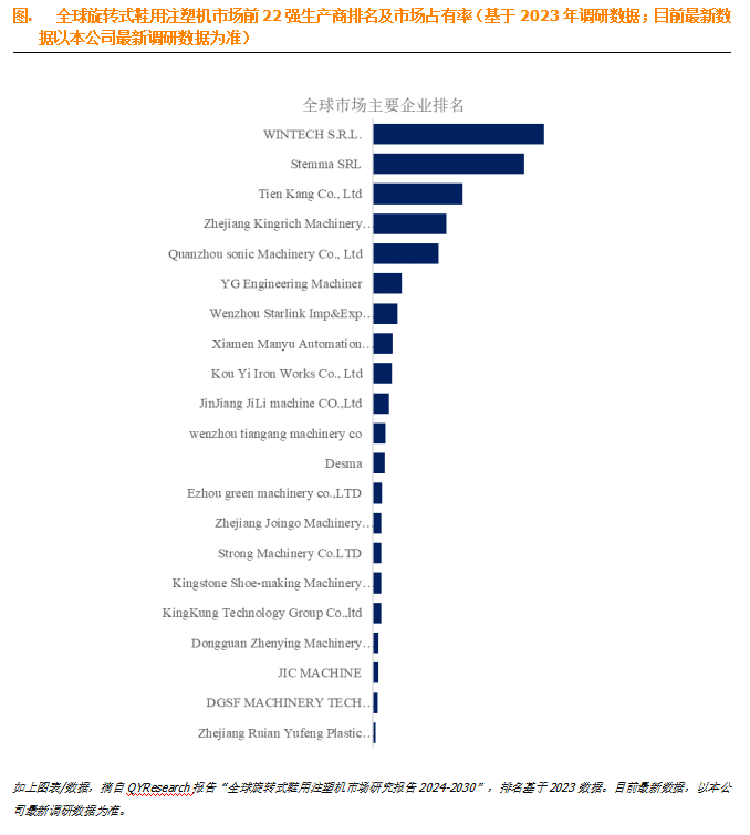 根据QYResearch头部企业研究中心调研,全球范围内旋转式鞋用注塑机生产商主要包括WINTECH S.R.L.、Stemma SRL、Tien Kang Co., Ltd、Zhejiang Kingrich Machinery Equipment Co., Ltd、Quanzhou sonic Machinery Co., Ltd、YG Engineering Machiner、Wenzhou Starlink Imp&Exp Trading Co., Ltd、Xiamen Manyu Automation Technology Co、Kou Yi Iron Works Co., Ltd、JinJiang JiLi machine CO.,Ltd等。2023年,全球前五大厂商占有大约17.3%的市场份额。