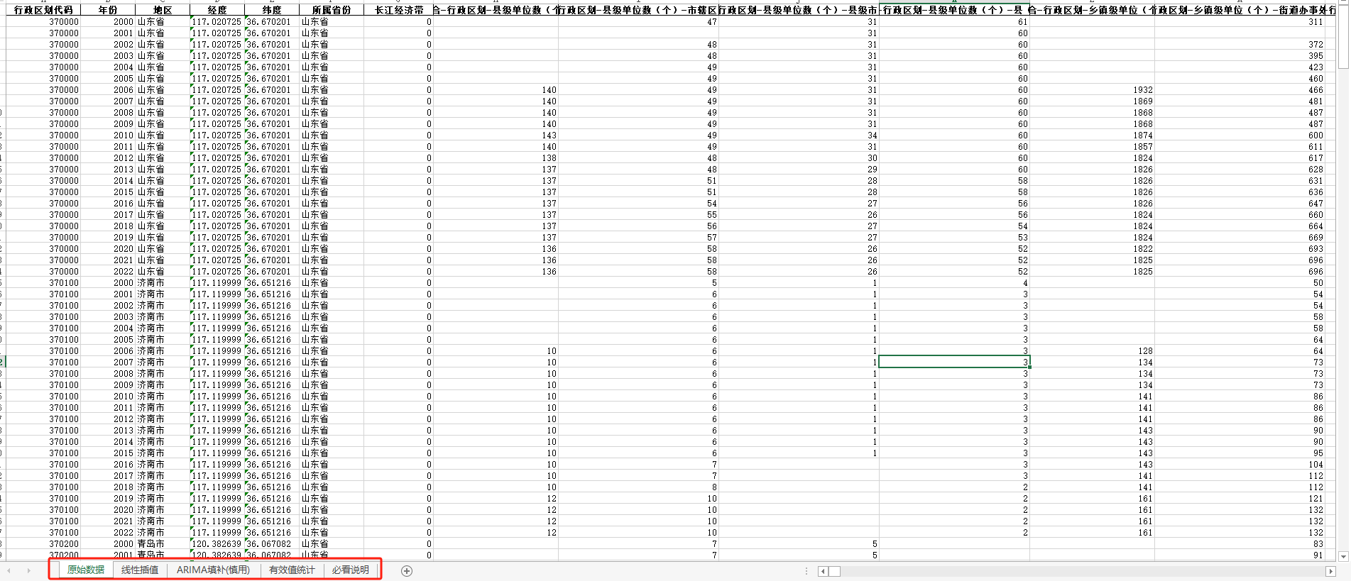 山东省面板统计数据库(包含四个页签:原始数据、线性插值、ARIMA填补、有效统计值四个页签),整理了山东省统计年鉴2001-2023年,数据年度2000-2022年,包含山东省17个城市数据。